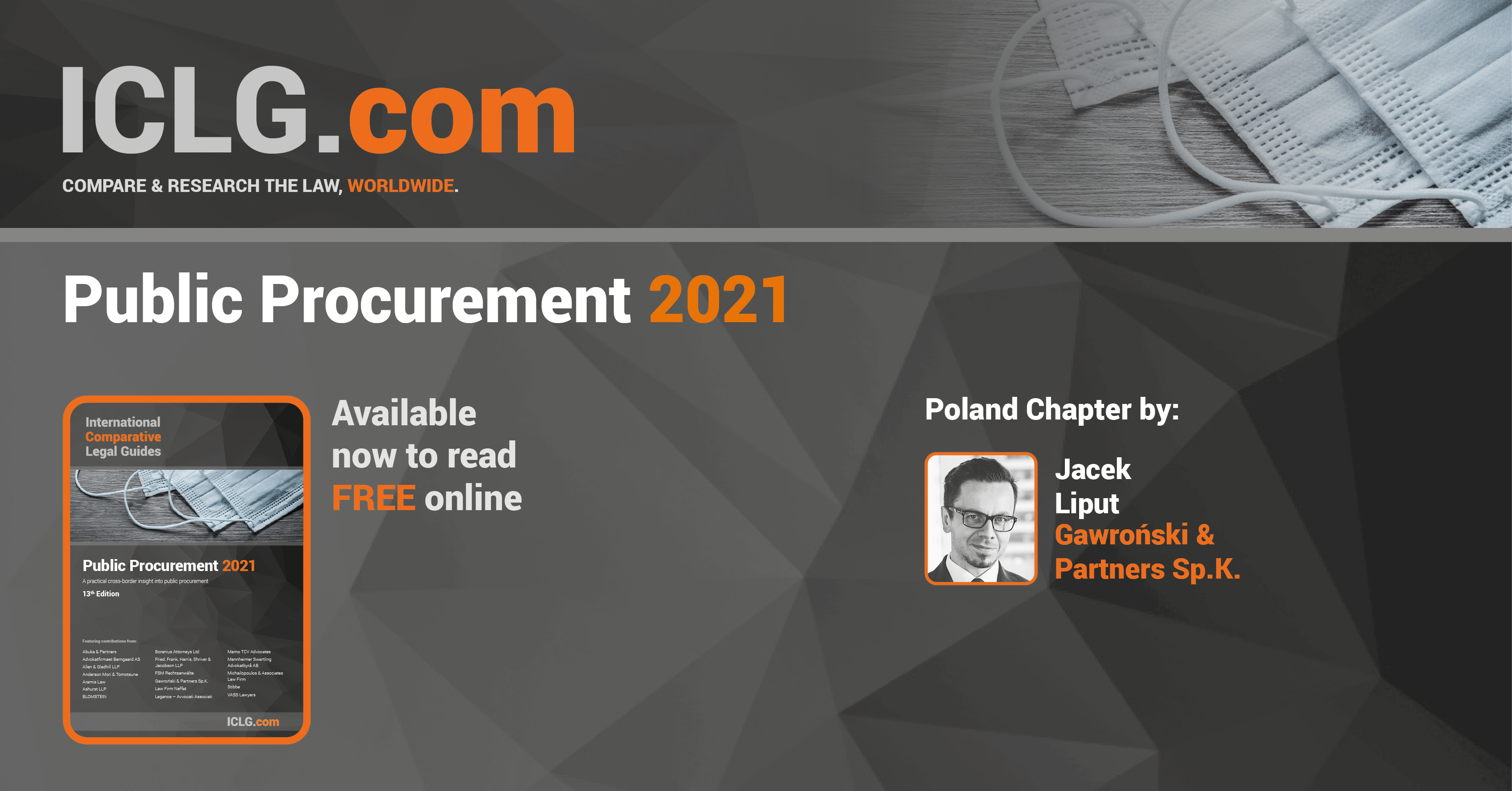 Od początku 2021 roku obowiązuje w Polsce zupełnie nowa ustawa Prawo zamówień publicznych. Przy tej okazji mec. Jacek Liput został zaproszony do przygotowania rozdziału w międzynarodowej publikacji International Comparative Legal Guide – Public Procurement 2021, która stanowi podsumowanie zasad udzielania zamówień publicznych w 18 jurysdykcjach. Publikacja została opracowana i opublikowana we współpracy z Global Legal Group z siedzibą w Londynie. Zapraszamy do czytania – polski rozdział jest dostępny po kliknięciu w baner.